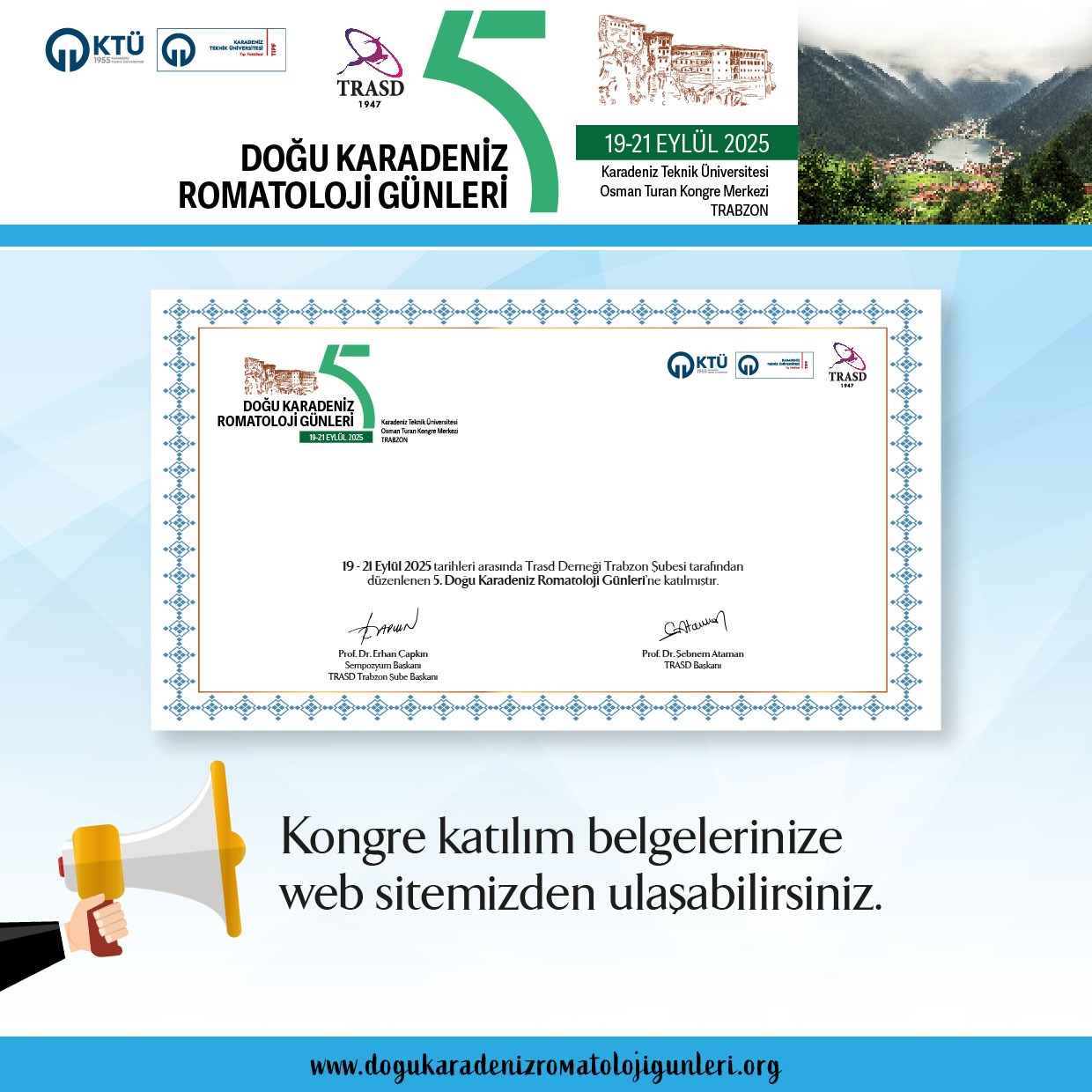 Türkiye Romatizma Araştırma ve Savaş Derneği (TRASD) Trabzon şubesi olarak bu yıl beşincisini gerçekleştireceğimiz "Doğu Karadeniz Romatoloji Günleri" 19-21 Eylül tarihleri arasında Karadeniz Teknik Üniversitesi Osman Turan Kongre merkezinde gerçekleştirilecektir.